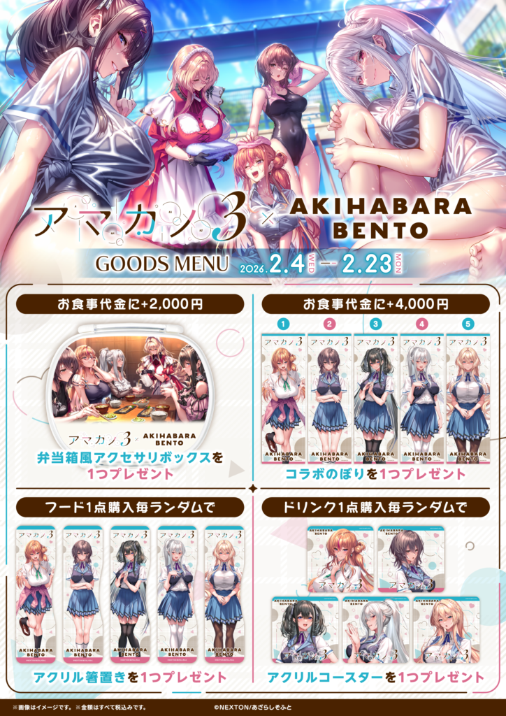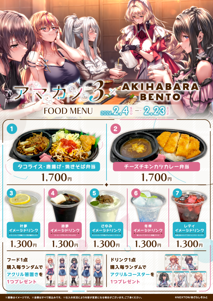 EVENT 2.4~2.22『アマカノ3』×AKIHABARA BENTOコラボ開催! 2026年1月26日 2026年1月28日 bento ゲームメーカー あざらしそふと様が送る『アマカノ3』のコラボが2月4日より開催決定!オリジナルコラボフード・ドリンクの提供のほか、オリジナルグッズの販売も行います!