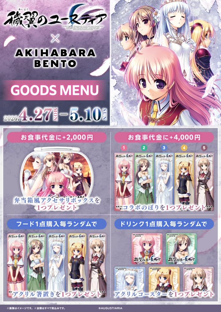 EVENT 4.27~5.10『穢翼のユースティア』×AKIHABARA BENTOコラボ開催! 2026年4月27日 2026年4月28日 bento ゲームメーカー オーガスト様が送る『穢翼のユースティア』のコラボが4月27日より開催決定!オリジナルコラボフード・ドリンクの提供のほか、オリジナルグッズの販売も行います!
